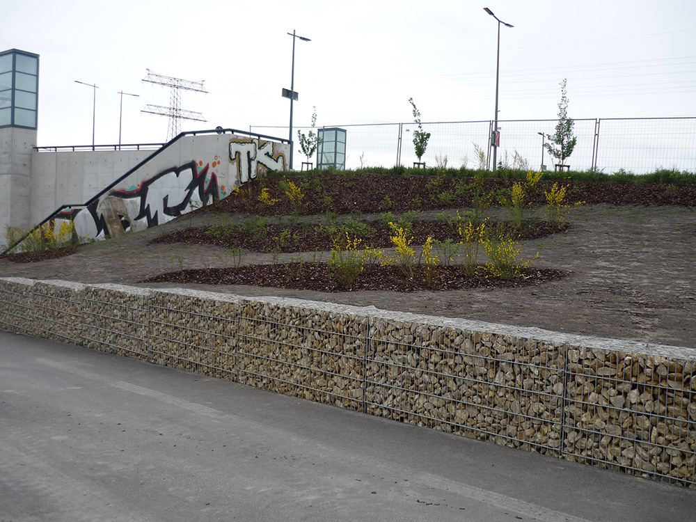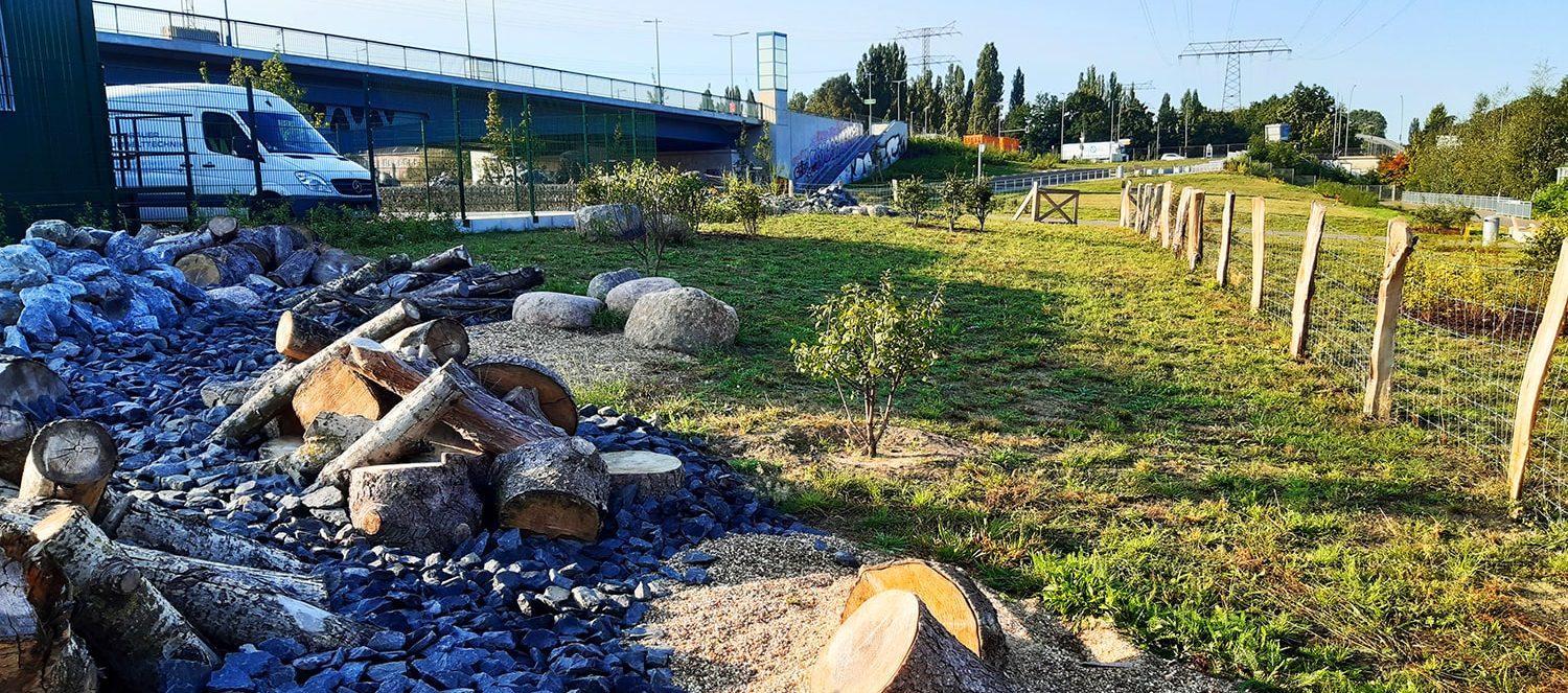 Insofern dient das Eidechsenhabitat an der SOV als vorgezogene Kompensationsmaßnahme für künftige Projekte. In der Grünanlage wurde ein Areal ausgewiesen, auf dem günstige Voraussetzungen für die Ansiedelung der Zauneidechsen geschaffen wurden. Die Fläche liegt sonnenexponiert und wurde mit unterschiedlichen Kleinstrukturen ausgestattet. Hier wechseln offene Pionier- und Halbtrockenrasenflächen mit offenen Kies- und Schotterflächen, in denen Baumstämme und Baumwurzeln eingelassen sind. Strauchgruppen bieten Rückzugsräume; der Untergrund ist für die Überwinterung geeignet.