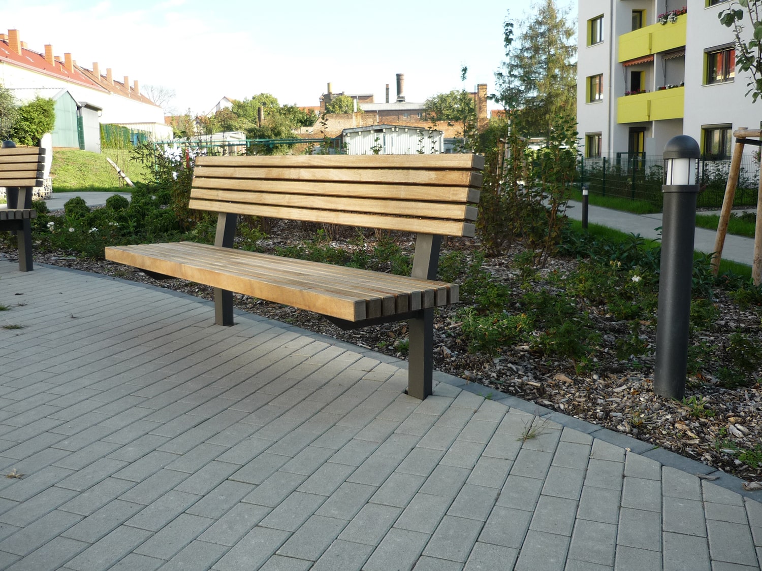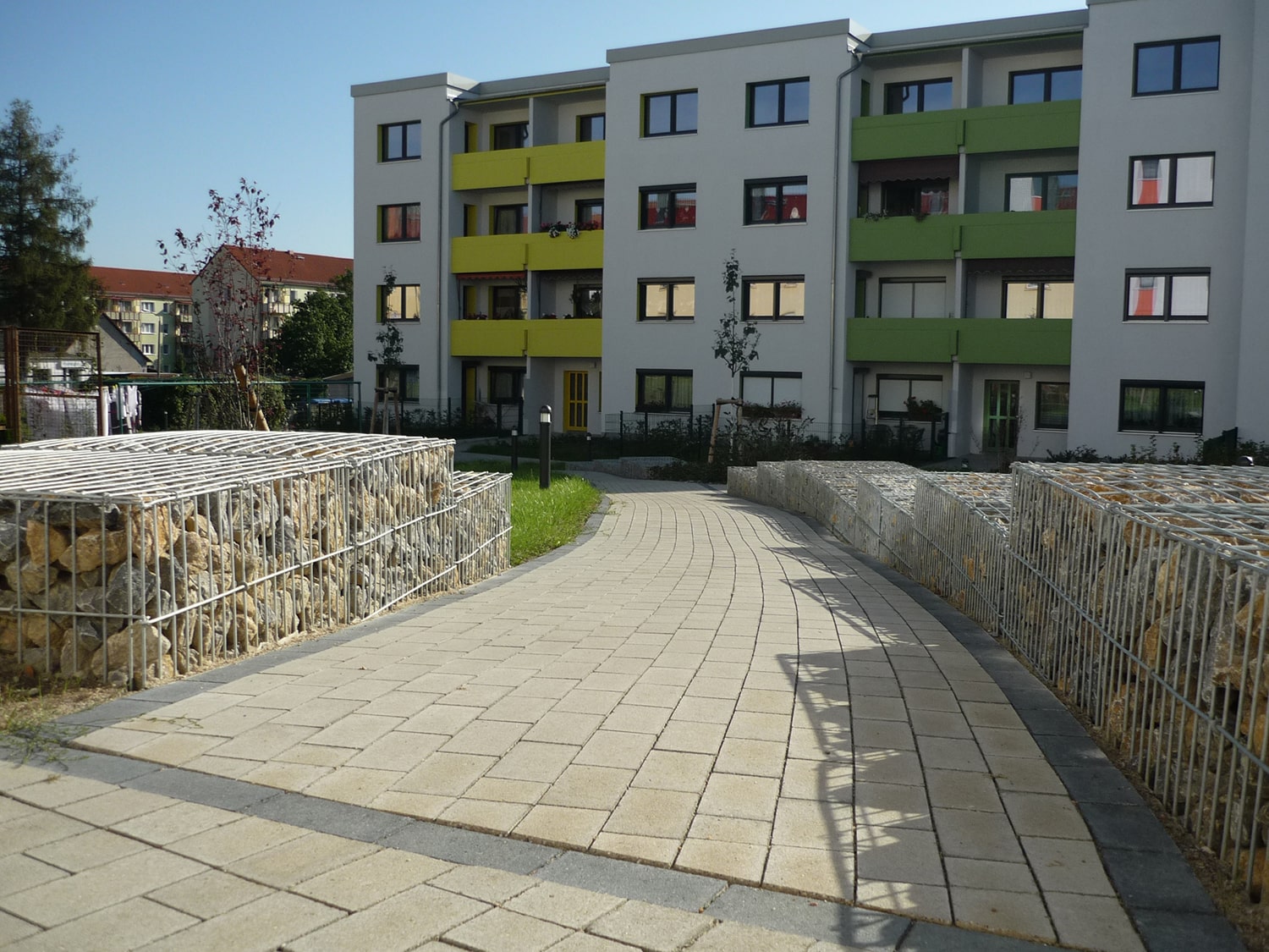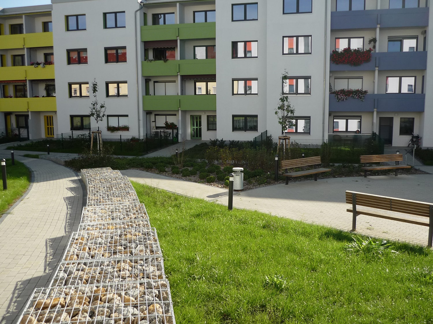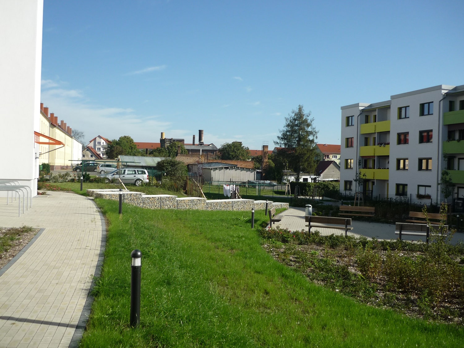 • Vier Erdgeschosswohnungen werden neue Mietergärten vorgelagert. Während der zentrale Platz sowie die gebäudenahen Flächen intensiv bepflanzt werden, bleiben große Teile des Freiraums als Rasenflächen bestehen, auf denen Wäschestangen ihren Platz finden.