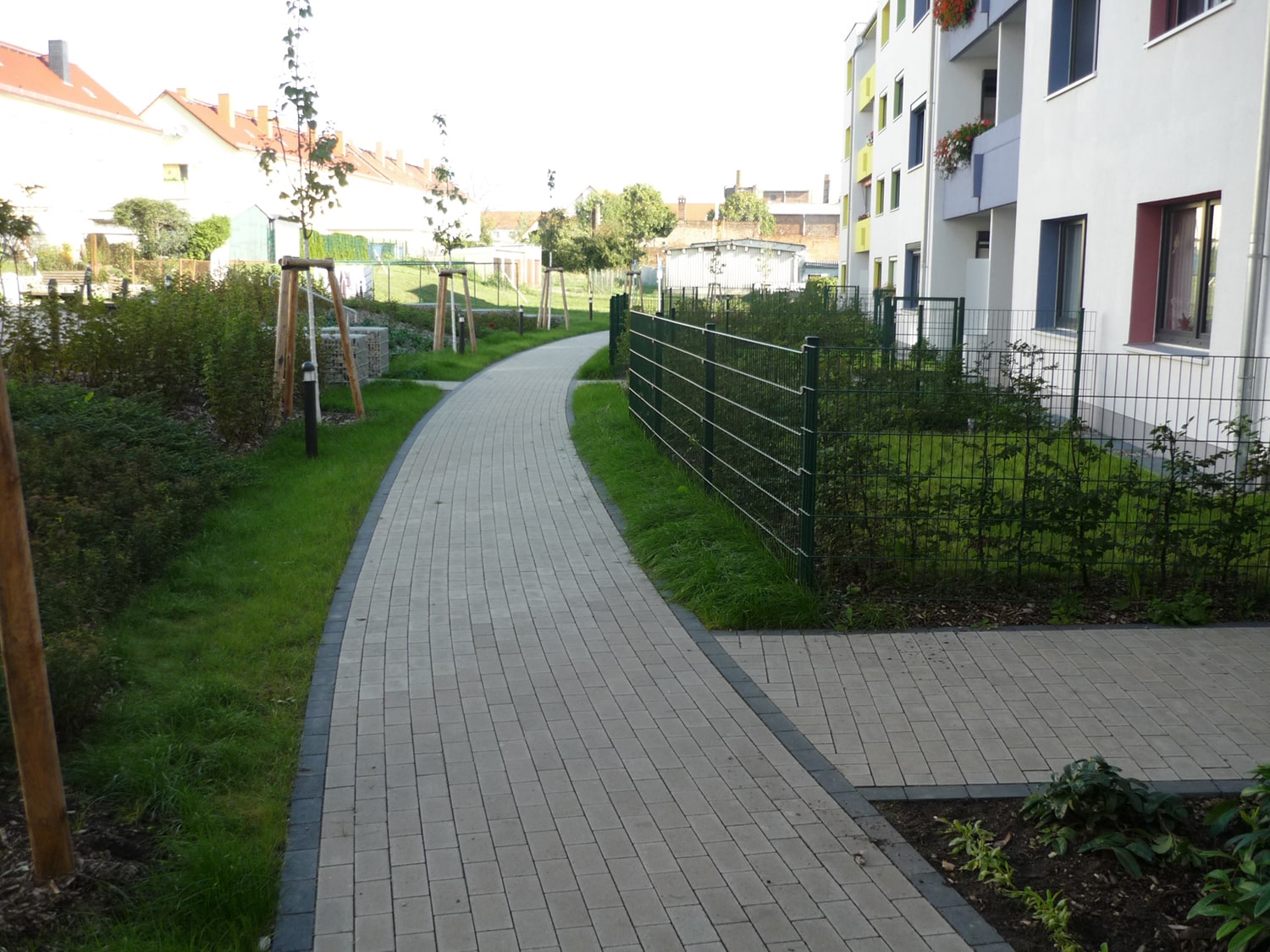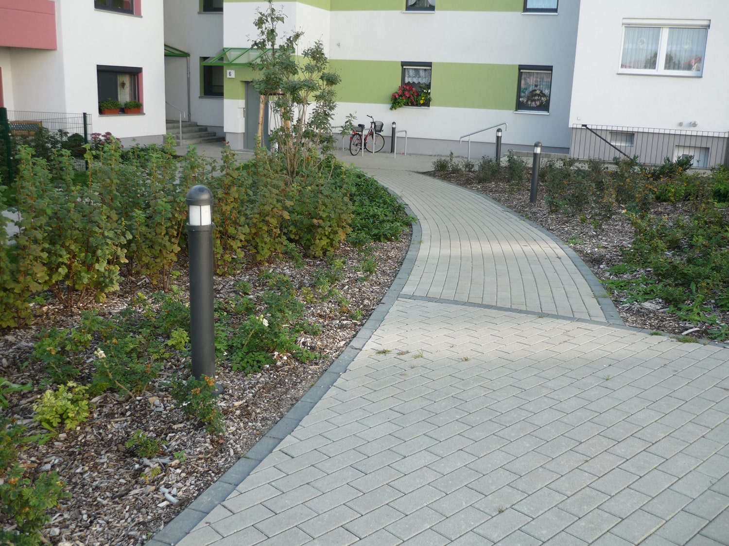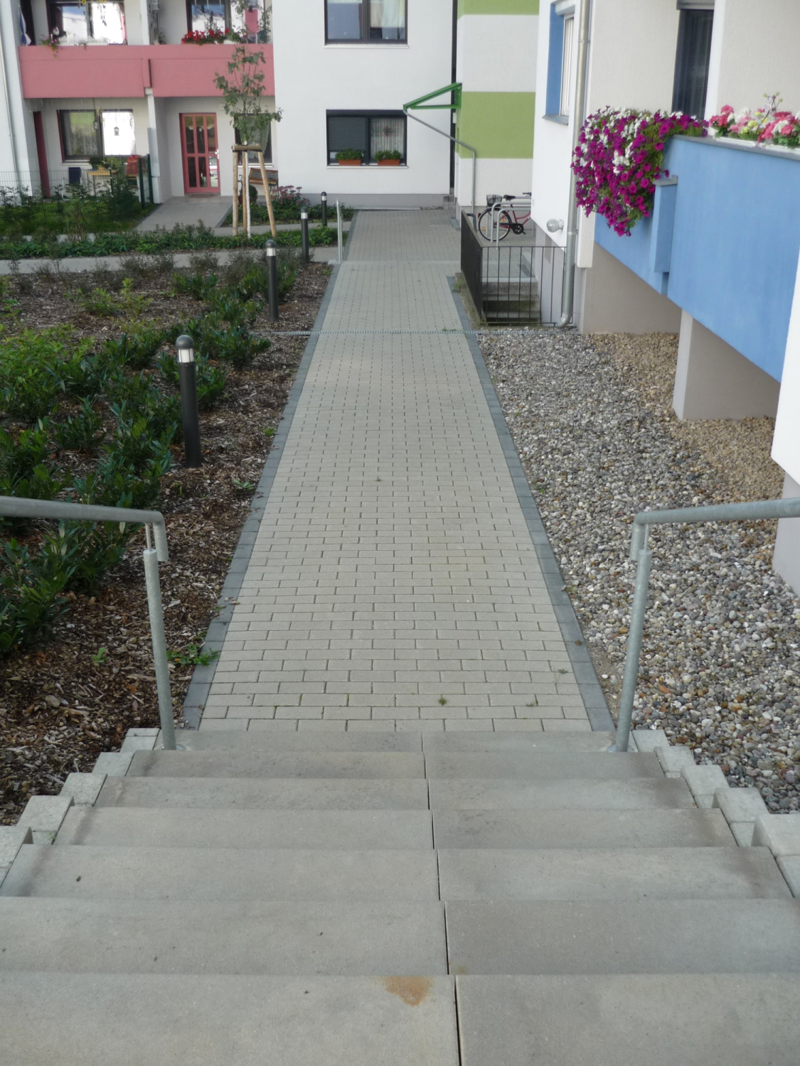 • Die zentrale Mülltonnenfläche liegt gestalterisch abgeschirmt nahe dem Zugang zur öffentlichen Straße.